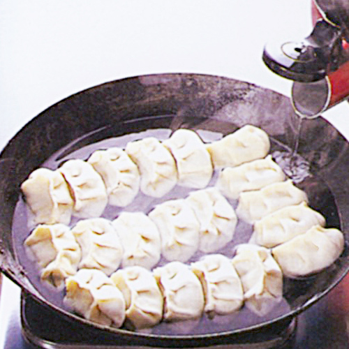 • 点火と同時に熱湯を入れる、餃子が七分目浸る位、ガスは強火で。